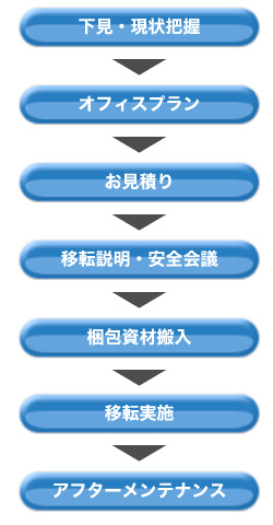 お客様のお悩み・ご要望に合わせたご提案や、ご担当者様に代わって移転準備の作業を行い、広範囲にわたる移転業務を打ち合わせから実施、アフターサービスまで責任を持ってサポートいたします。